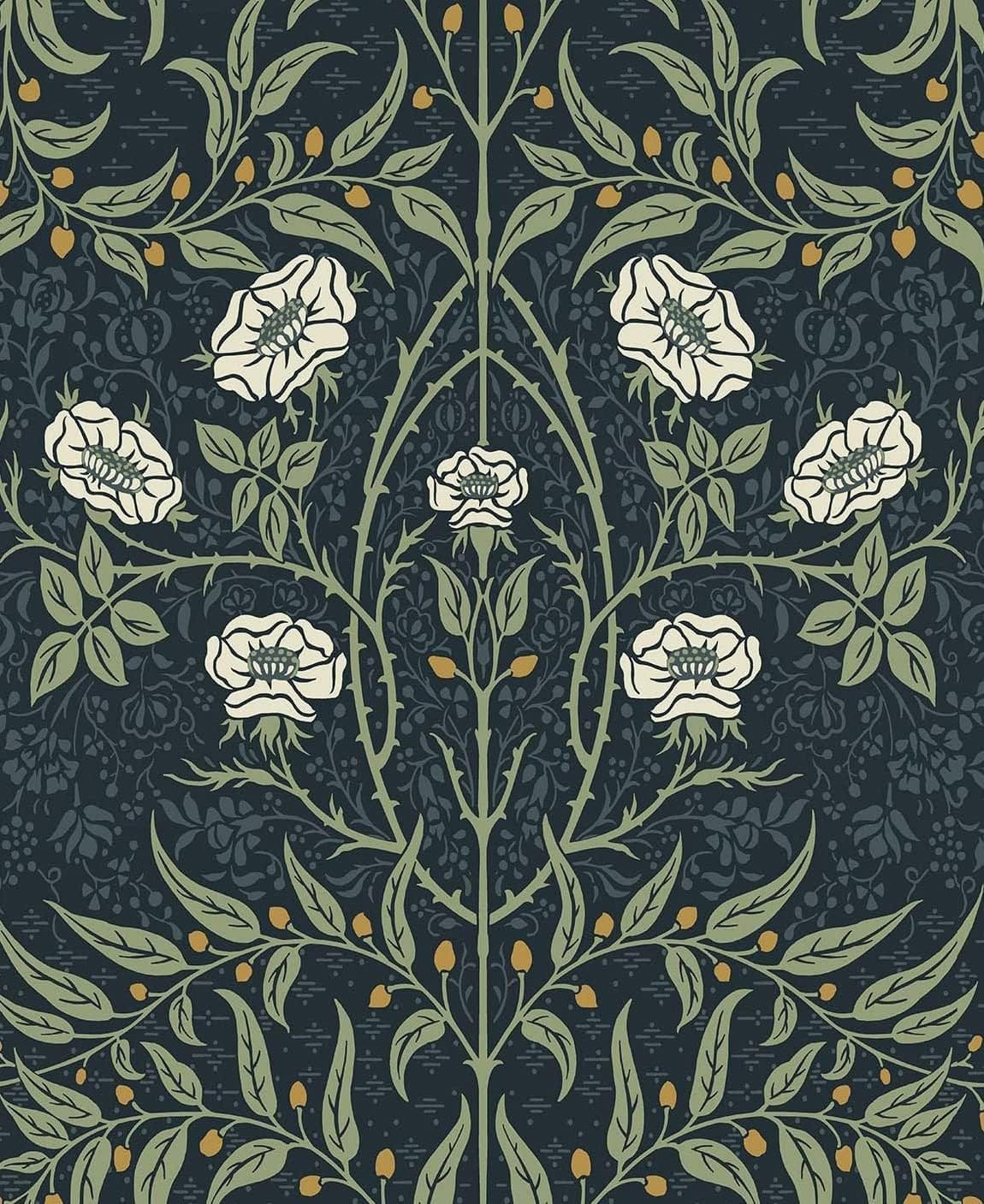 I chose a bold navy blue paint color for the walls to match the area rug perfectly. It turned out dramatic, sophisticated, and modern. I lived with it like that for seven years until I decided to take the design up a few notches by adding wallpaper in the same color scheme. I chose this William Morris-inspired peel and stick wallpaper.