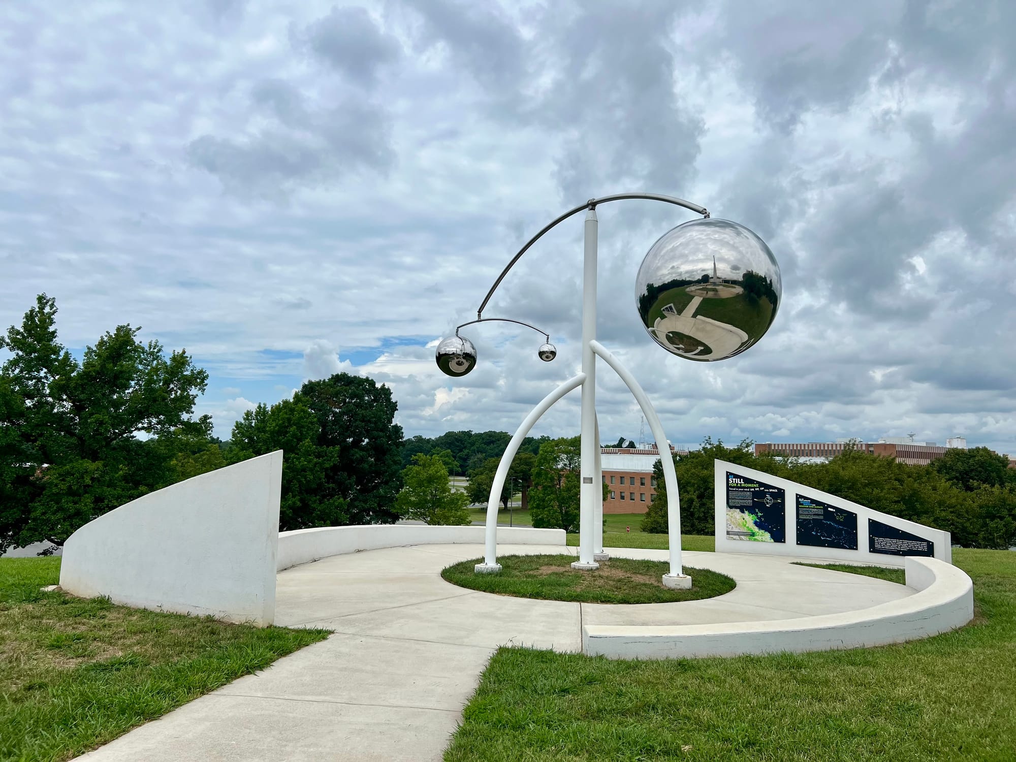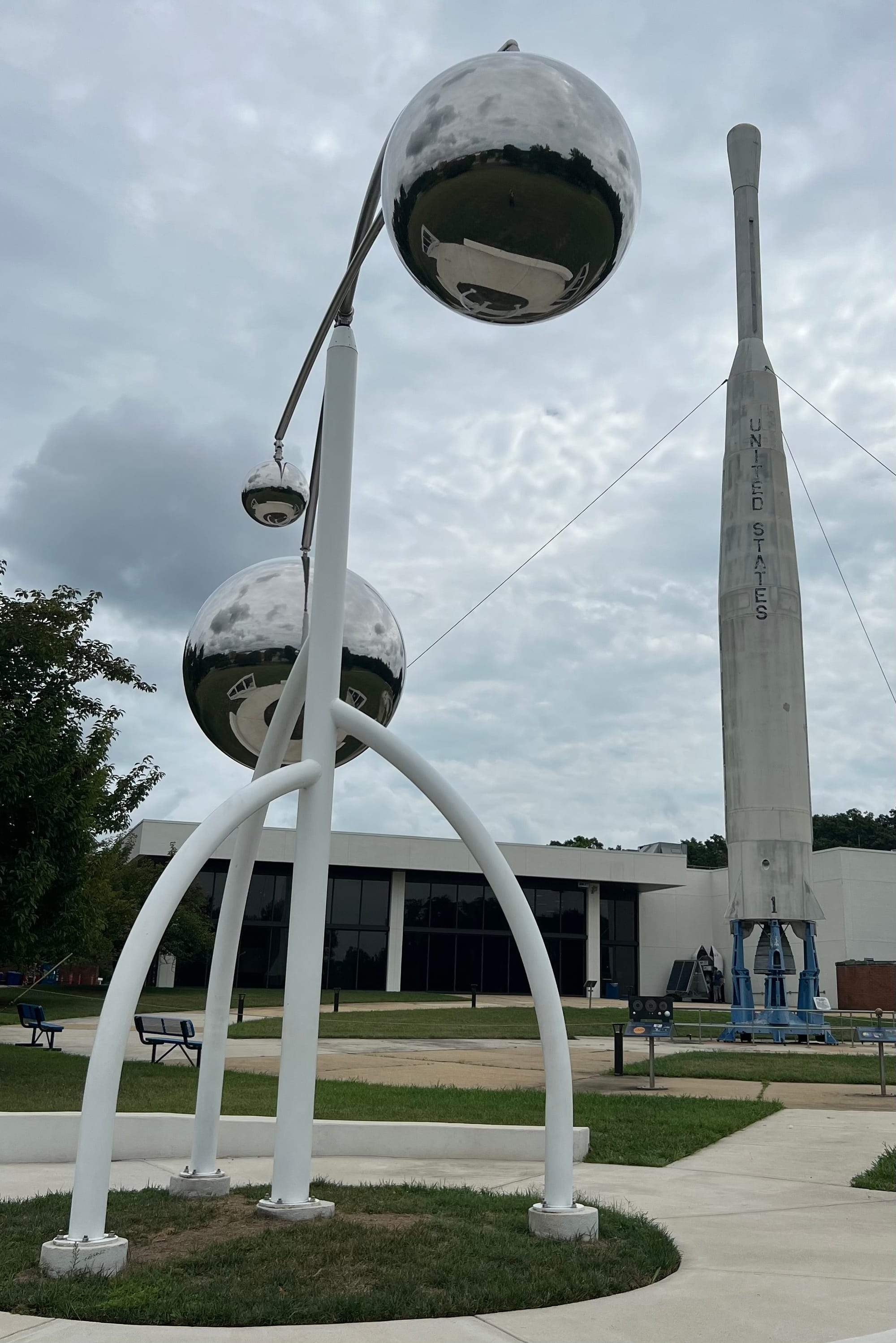 My favorite display of the rocket garden is this abstract kinetic sculpture with three mirrored orbs representing the Sun, Earth and the satellites activated by the wind. Unfortunately, Sunday wasn’t a windy day.
