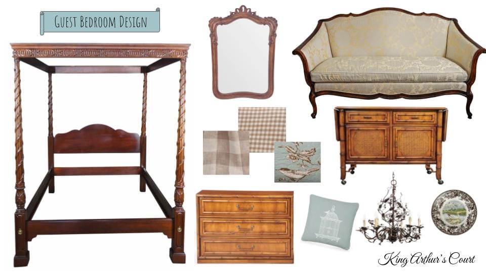 The ornately-carved canopy bed will be flanked by nightstands, or rather a repurposed dresser to one side and a repurposed buffet to the other. With a faux bamboo motif, the two pieces are quite similar in appearance. The width and depth of each is perfect, though a disparity in the height will need to be rectified by adding “feet” to one.