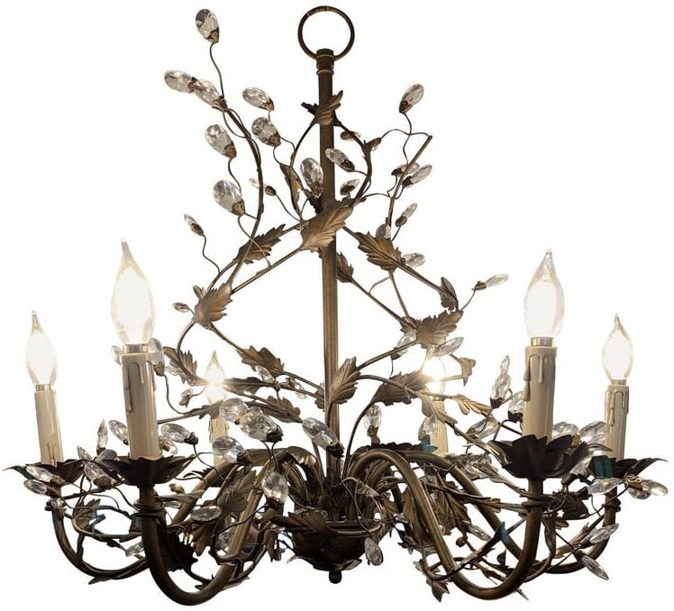 The botanical charm continues with this luxurious chandelier laden with leaf-covered vines that gracefully entwine six delicate candle arms. Repurposed from my dining room, the chandelier also has an abundance of crystals that further bounces light around the room. It’s a rather large chandelier, but the 9’ ceilings easily accommodate the grandeur of the piece.