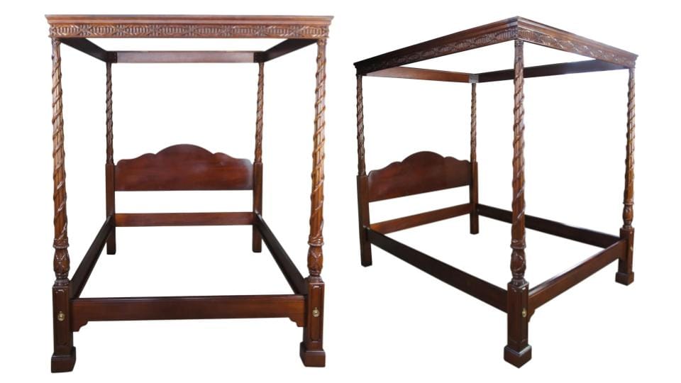 The beautiful canopy bed I chose is a statement piece. Manufactured by Hickory Chair Co.–a high-end furniture brand–as part of their James River Collection, it was released in the mid 1980s and is sadly no longer in production. I’ve adored this piece for ages and was able to purchase it second-hand on eBay for just $800. While not strictly French provincial, the bed’s red and ribbon hard-carved detailing and warm color lend itself to the overall aesthetic I’m going for. While it was a vintage piece, it was so well taken care of it looks practically new.